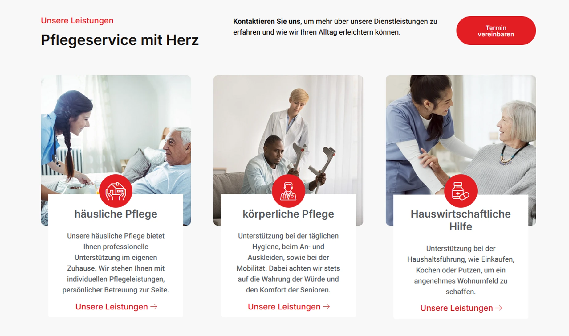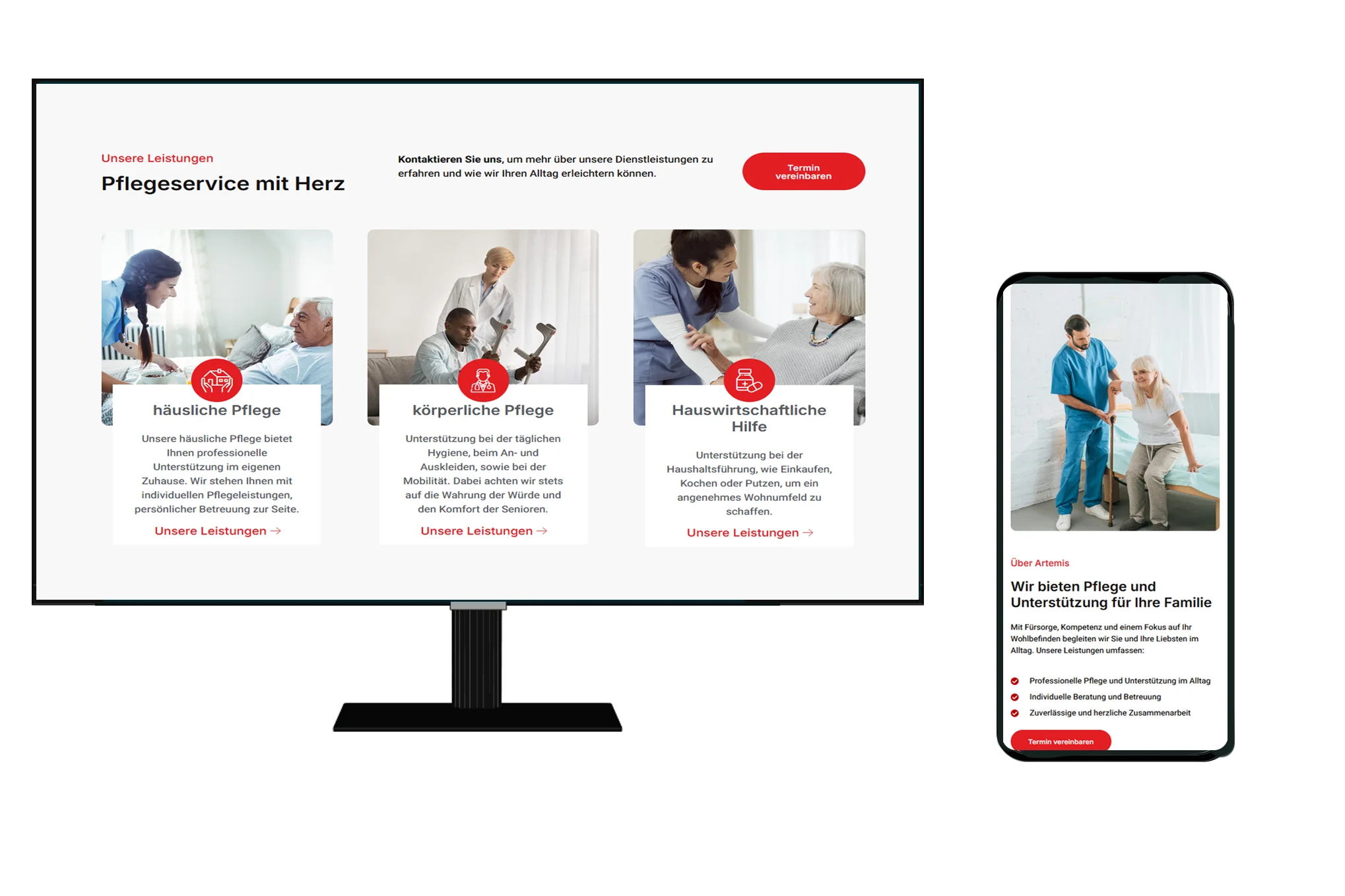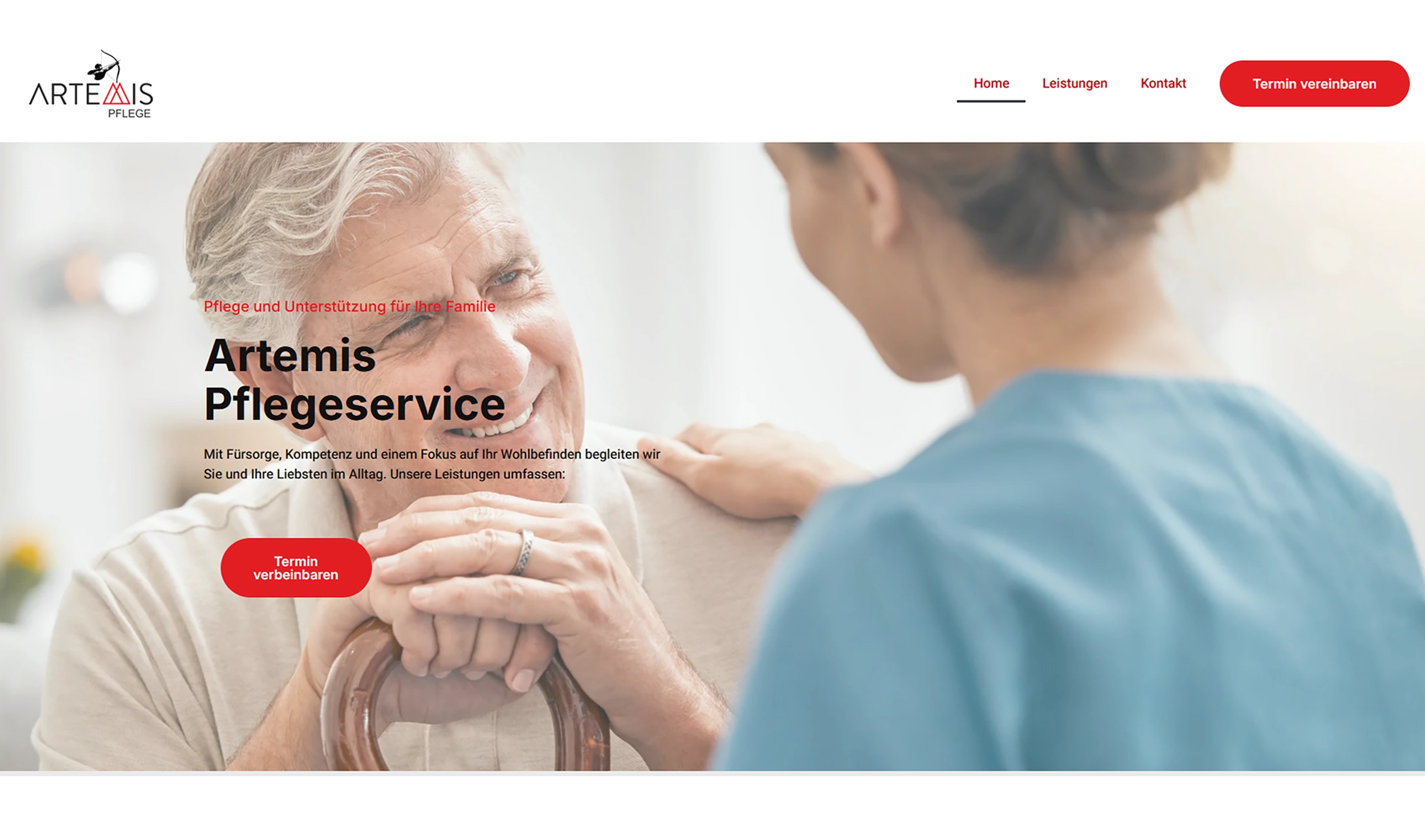 For this project, I created a modern and user-friendly website for Artemis Pflege, an ambulatory care provider based in Dortmund, Germany. The goal was to clearly present their services – including home nursing, household support, and personal care – while ensuring accessibility and trustworthiness for patients and their families.