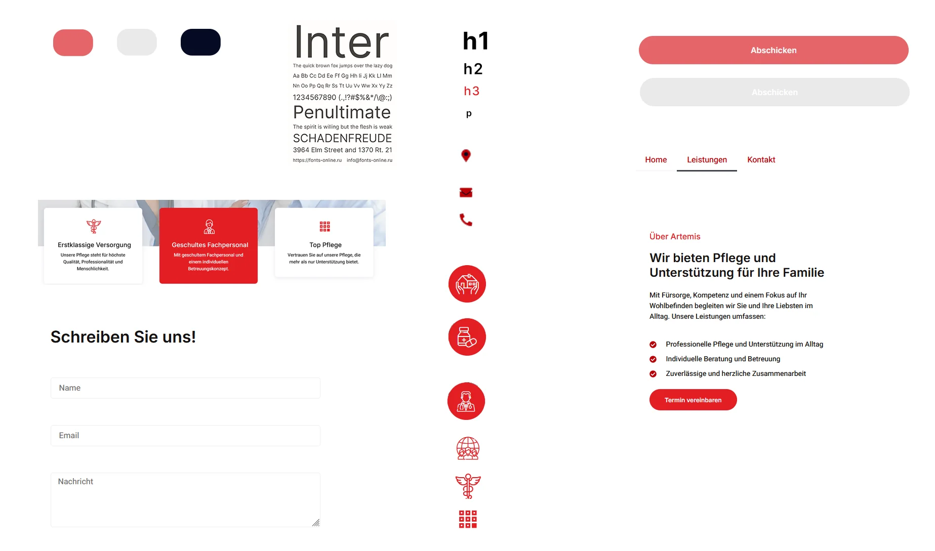 Choosing Inter for headings and Heebo for body text was a deliberate and effective choice for artemis-pflege.de. Inter’s modern, versatile design gives the headings a clear and confident presence — perfect for drawing attention and reflecting professionalism. Heebo, with its smooth, humanist touch, ensures excellent readability and adds a warm, approachable tone to longer texts, creating a balanced and accessible reading experience.