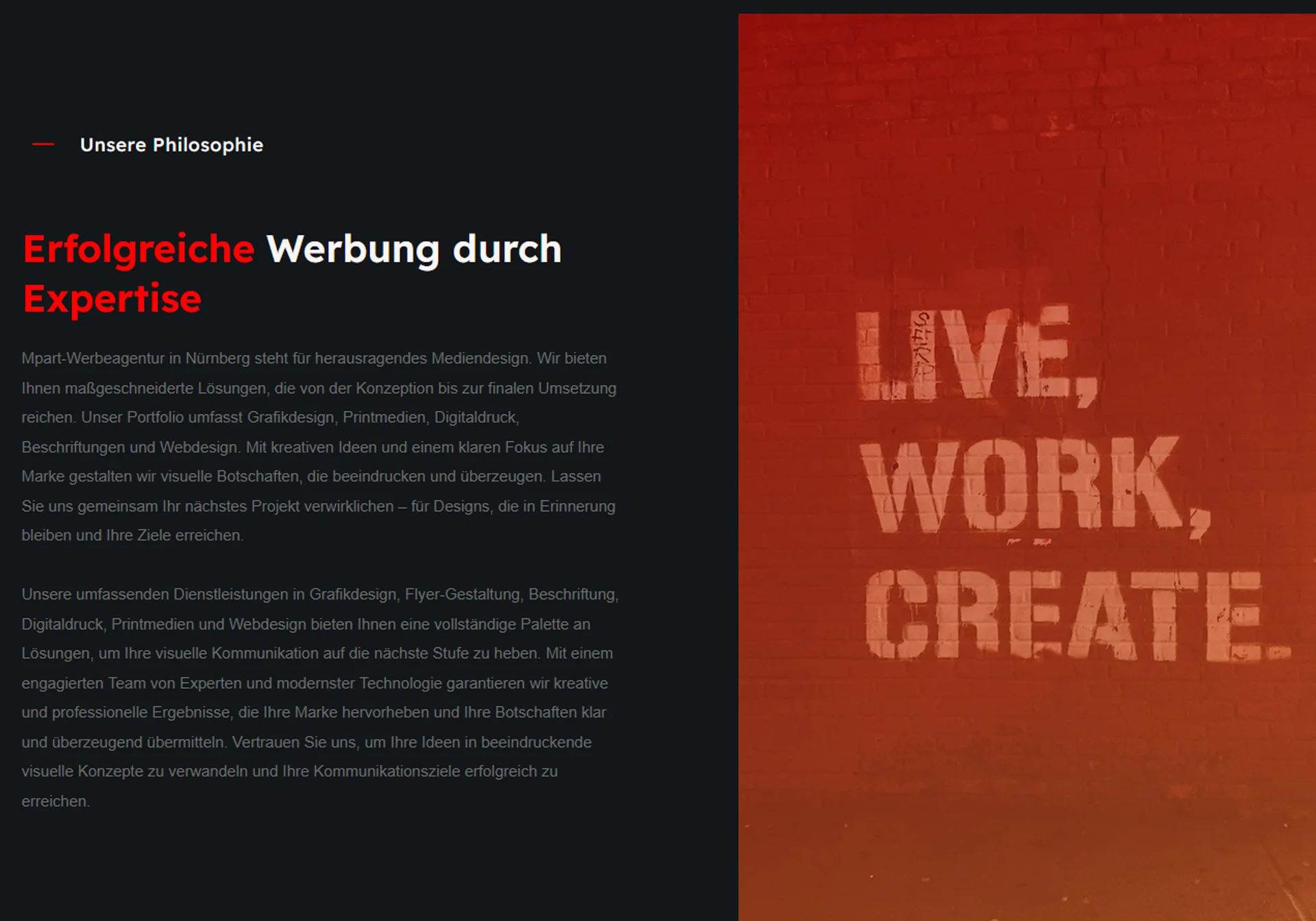 Choosing Lexend Deca for headings and Poppins for body text was a deliberate and effective choice for mpart-werbeagentur.de. Lexend Deca gives the headings a modern, confident, and slightly distinctive character—perfect for capturing attention while conveying expertise and professionalism. Poppins, with its clean, geometric structure, ensures excellent readability and a friendly, approachable tone in longer texts.